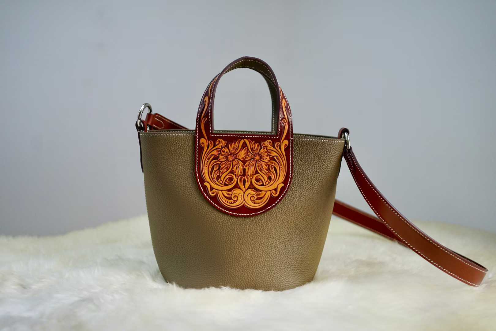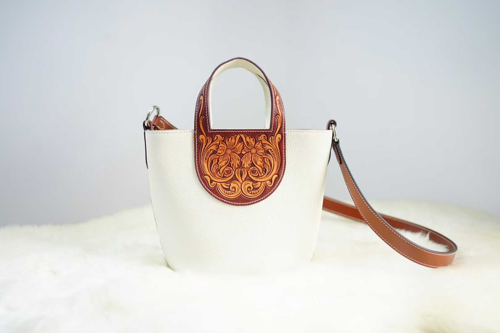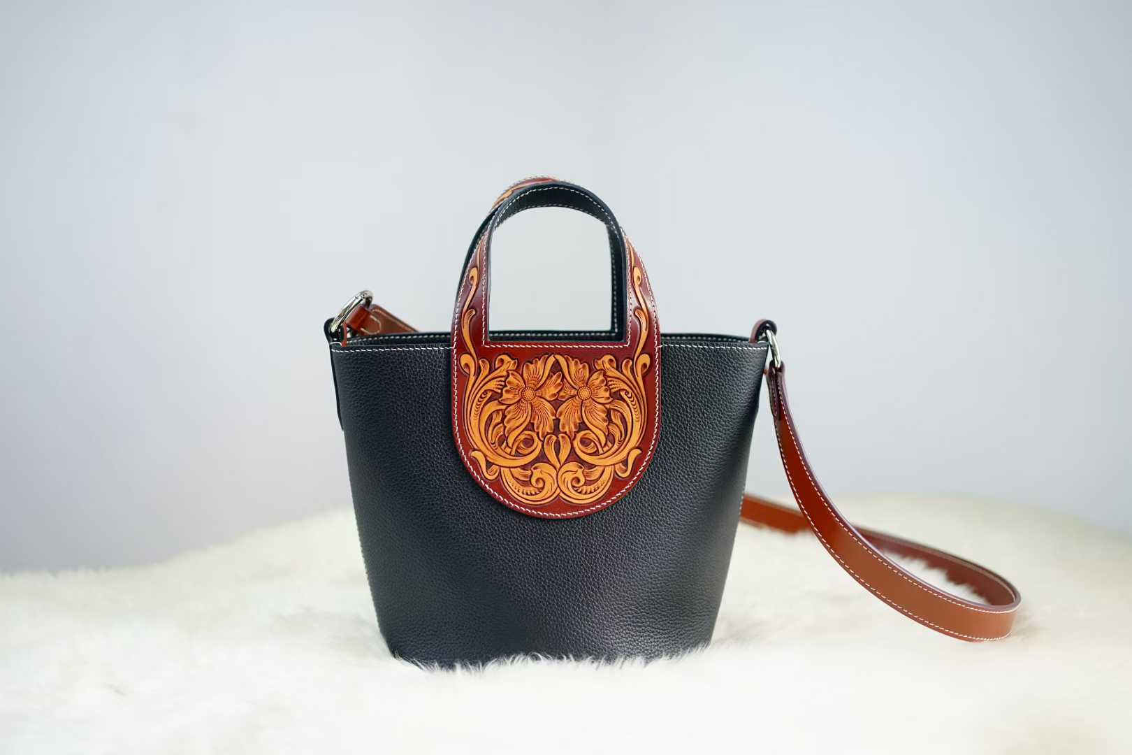 Make a bold statement with our Tan Pebble Leather Bucket Bag, a masterpiece of texture and contrast. This distinctive piece showcases a beautiful duality: a sleek, modern bucket silhouette in textured pebble leather juxtaposed with a rich, hand-tooled floral panel in a deeper sienna hue. The intricate, deep-carved Western floral motif on the handle base adds a soulful, artisanal edge, making each bag a rare piece of wearable art.