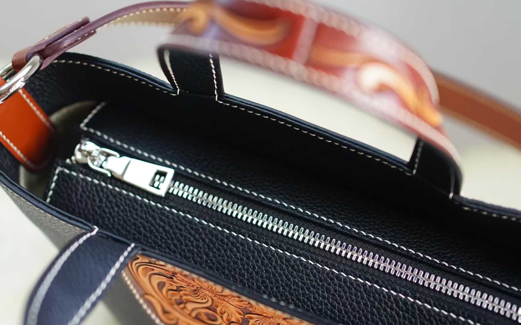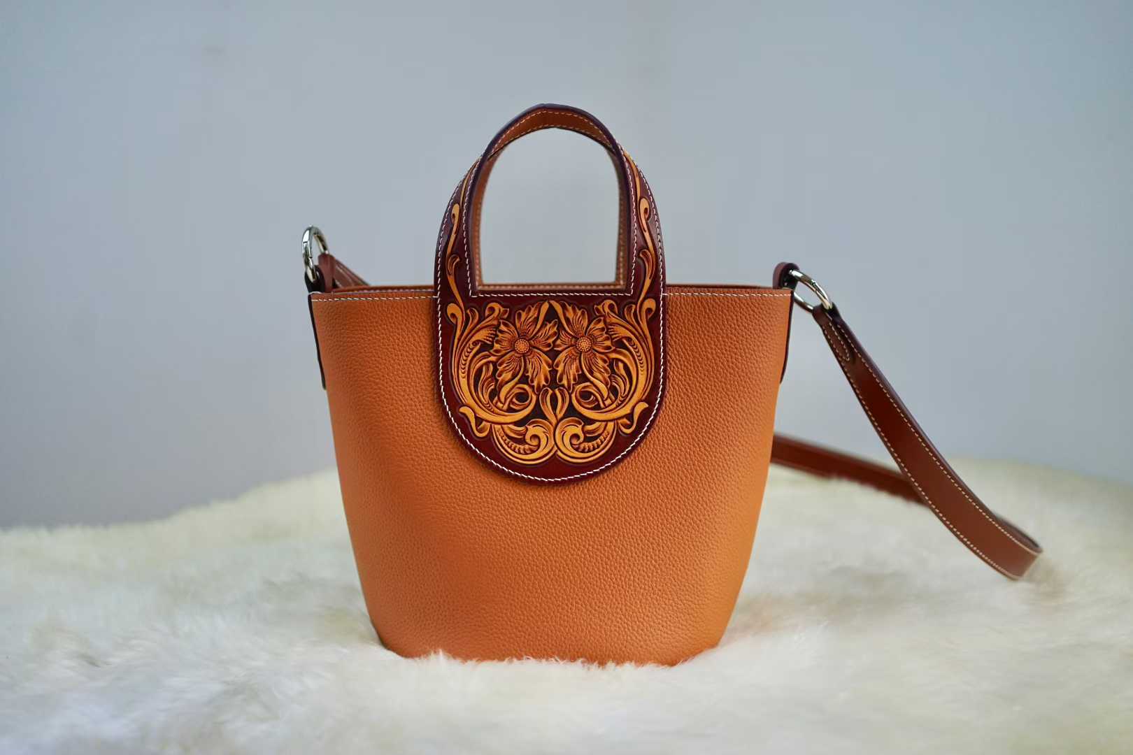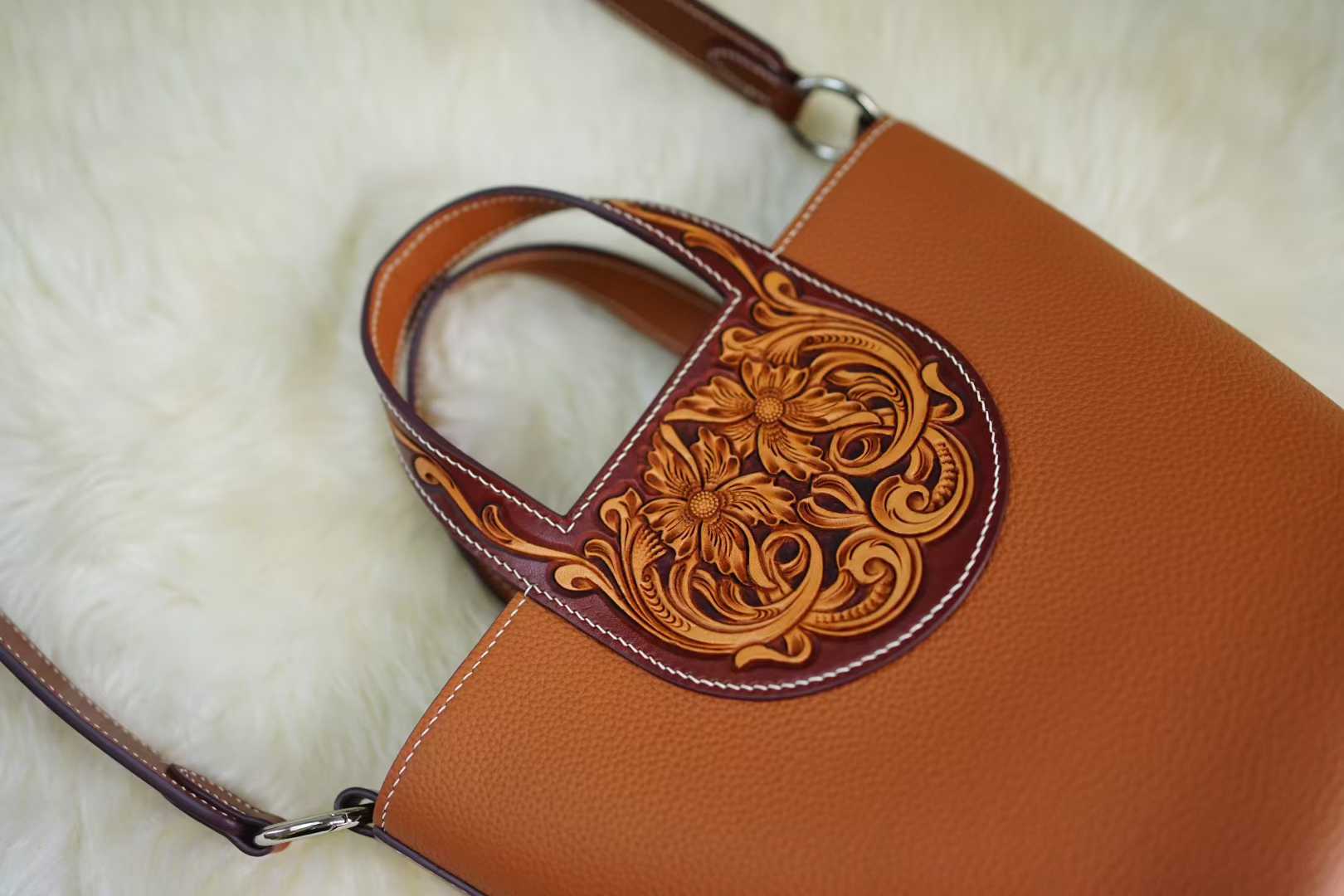 Make a bold statement with our Tan Pebble Leather Bucket Bag, a masterpiece of texture and contrast. This distinctive piece showcases a beautiful duality: a sleek, modern bucket silhouette in textured pebble leather juxtaposed with a rich, hand-tooled floral panel in a deeper sienna hue. The intricate, deep-carved Western floral motif on the handle base adds a soulful, artisanal edge, making each bag a rare piece of wearable art.