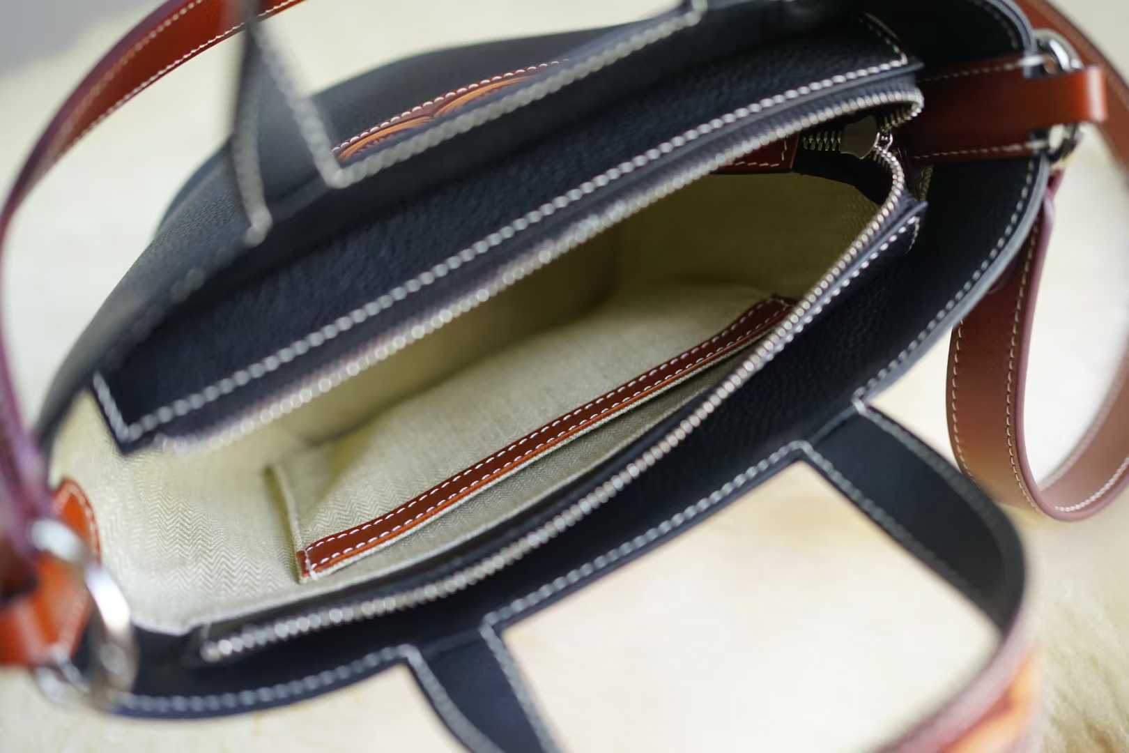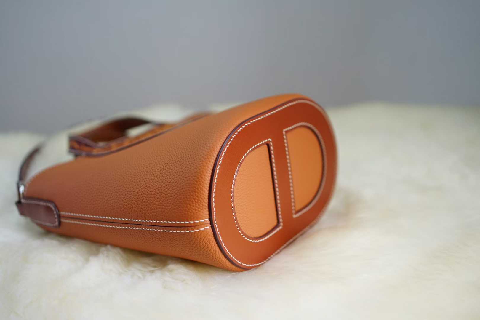 The bag's structured bucket shape ensures it stands upright and keeps your belongings safe and accessible. Designed for ultimate practicality, it features a unique, sculptural leather top handle for a sophisticated hand-carry option and a detachable, adjustable leather shoulder strap that allows for convenient crossbody wear. The smooth top opening leads to a spacious interior, detailed with reinforced stitching for lasting durability and style.